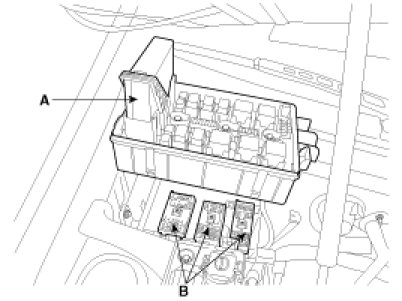 19. Remove the fuse & relay box (A) after disconnect from the connector (B).