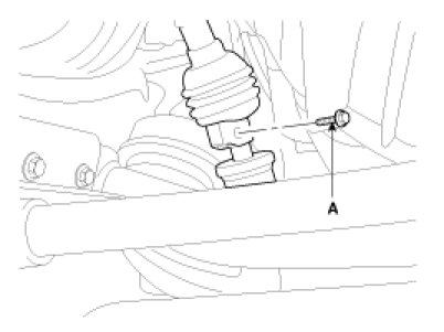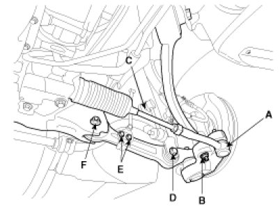 28. Remove the lower arm mounting bolt & nut (F) from the sub frame.