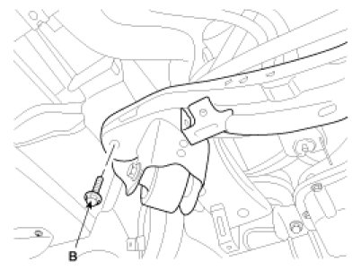 33. Support the sub frame (A) securely with a floor jack, and then remove the mounting bolts (B).