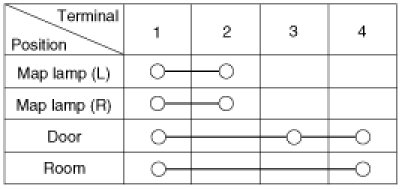 1. Remove the room lamp assembly then check for continuity between terminals.