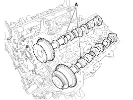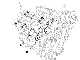 (4) Remove the LH/RH camshaft bearing cap (A) and thrust bearing cap (B).