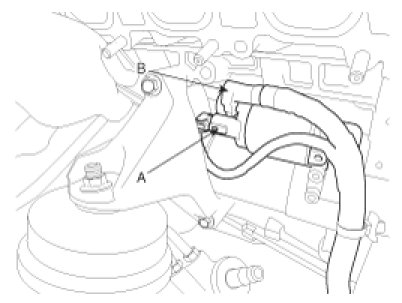 8. Loosen the engine mounting nut (A) and remove the engine mounting bracket (B).