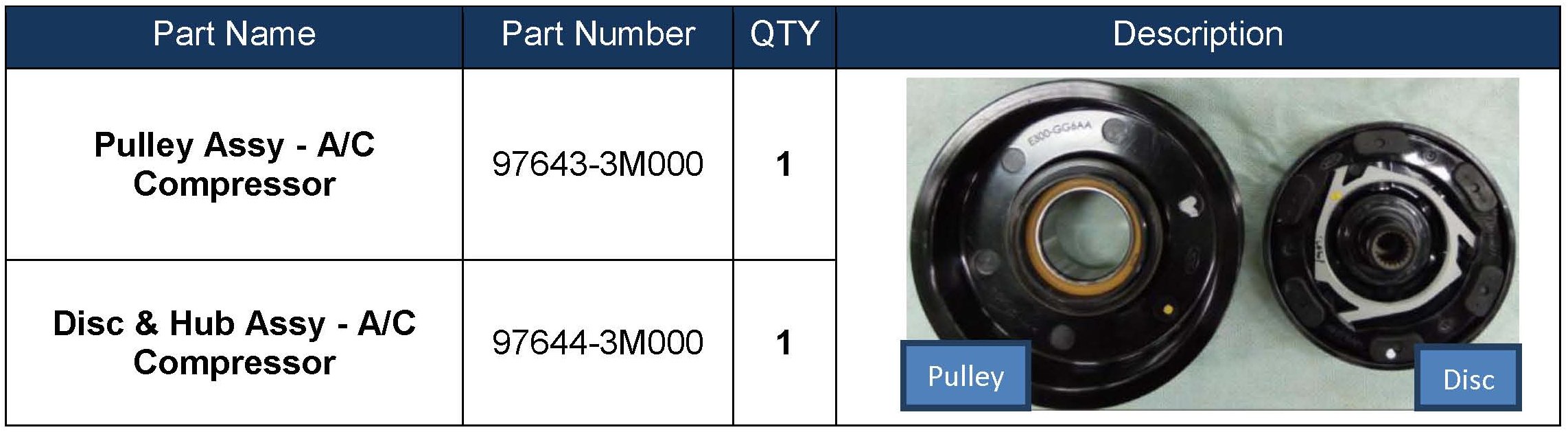 Follow the procedure outlined in this bulletin to replace the A/C Pulley Assembly and the A/C Disc & Hub Assembly to correct this condition.