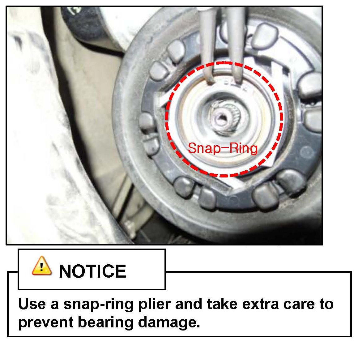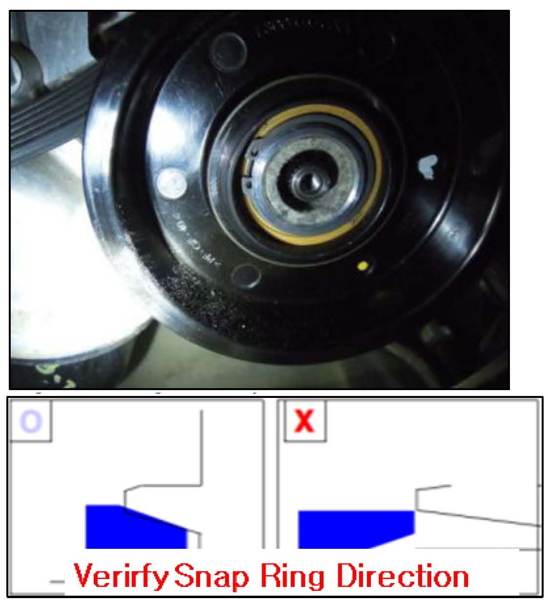 6. Position the new pulley onto the A/C compressor and reinstall the snap-ring with the facing bevel edge matching correctly as shown below.