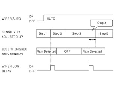 4. The drive may adjust the rain sensor performance by adjusting the sensitivity input. When in automatic mode, the BCM will perform a single wipe each time the sensitivity is adjusted upward to a more sensitive setting (downward more then one step). This single wipe will only be performed if Rain Detected signal is being received from the Rain sensor. If the sensitivity adjustment is adjusted upward more than one sensitivity, the BCM will only perform a single wipe unless the time between Increases is more than 2 seconds.