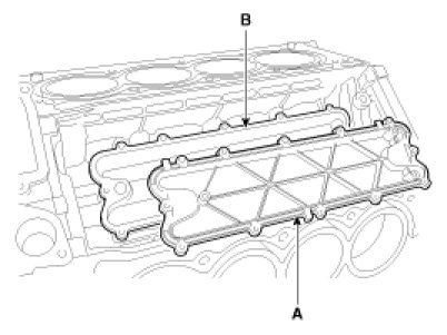 14. Install the cylinder block bank cover (A) and a new gasket (B).
