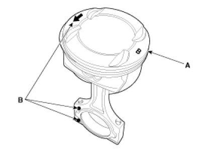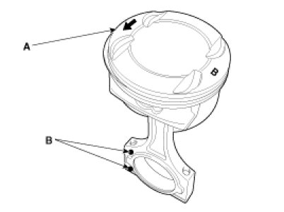 - The piston front mark (A) and the connecting rod front mark (B) must face the timing chain side of the engine.