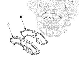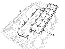 15. Install the cylinder block bank cover (A) and a new gasket (B).