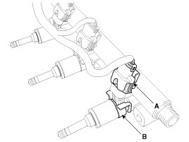 4. Remove the connector (A) and the fixing clip (B), and then separate the injector from the delivery pipe.