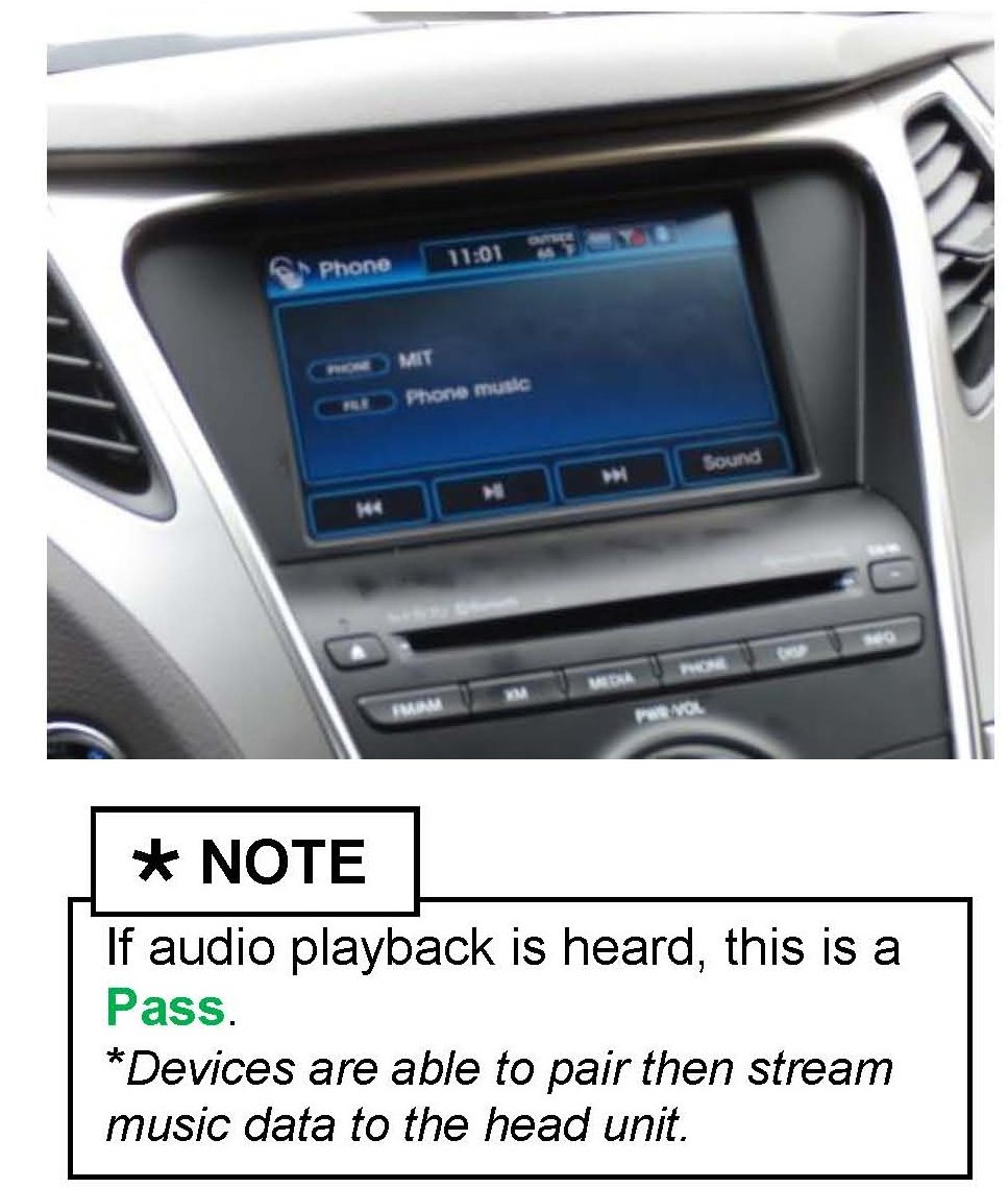To confirm head-unit functionality, the MIT device plays an audio file corresponding to one of the connection verifications that has been successfully completed. If an audio playback is heard corresponding to the test attempted, the head-unit has passed the test.