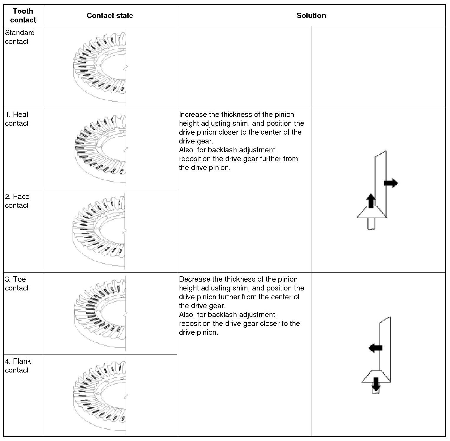 - Tooth contact pattern is a method for judging the result of the adjustment of drive pinion height and final drive gear backlash. The adjustment of drive pinion height and final drive gear backlash should be repeated until the tooth contact patterns are similar to the standard tooth contact pattern.