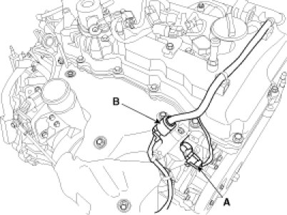 10. Disconnect the exhaust OCV (Oil control valve) connector (A) and the oxygen sensor connector (B).