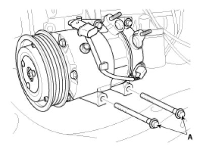 20. Remove the A/C compressor lower bolts (A).