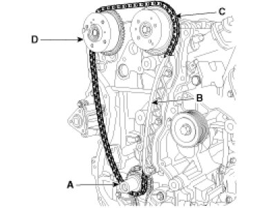 Crankshaft sprocket (A) -> Timing chain guide (B) -> Intake CVVT sprocket (C) -> Exhaust CVVT sprocket (D).