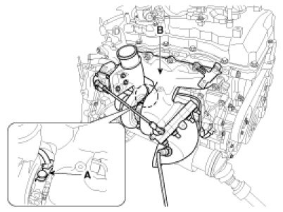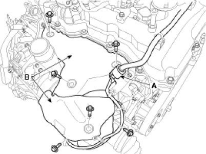 8. Disconnect the oil feed pipe (A) and then remove the turbo manifold module (B).