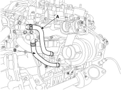 6. Disconnect the turbocharger water feed hose (A) and the water drain hose (B).