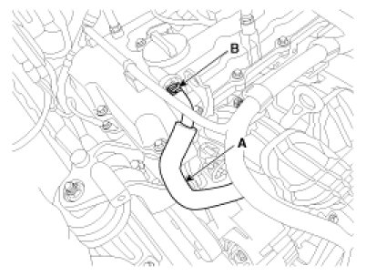 1. Insert a thin stick (A) into the PCV valve (B) from the threaded side to check that the plunger movement.