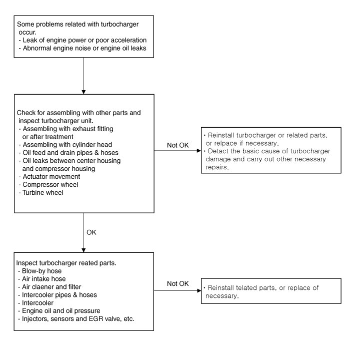 If any problem is not detected in the turbocharger, check the turbocharger-related parts according to the procedure as follows.