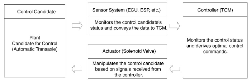 Automatic transaxle system relies on various measurement data to determine the current control status and extrapolate the necessary compensation values. These values are used to control the actuators and achieve the desired control output. If a problem with the drivetrain, including the transaxle, has been identified, perform self-diagnosis and basic transaxle inspection (oil and fluid inspection) and then check the control system's components using the diagnosis tool.