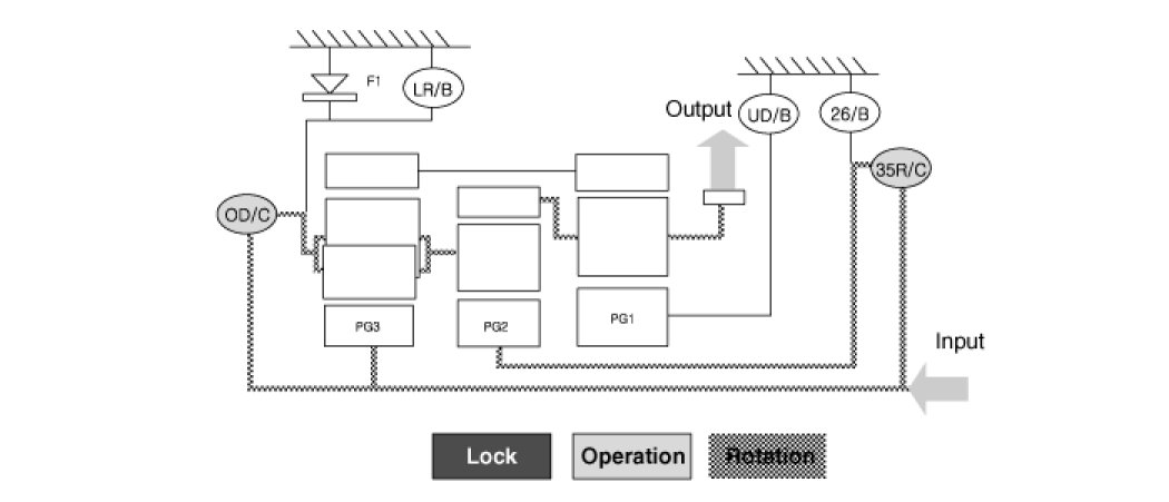 > Here, the rear planetary gear rotates in a 1:1 rotation ratio, as it would when the 4th gear is engaged; however, the front planetary gear remains unrestrained and the front sun gear rotates in the normal direction, at a zero load, and at a rotation ratio of 1:1.