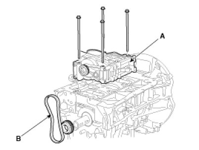 3. Install the balance shaft & oil pump module (A) with the chain (B) and sprocket.