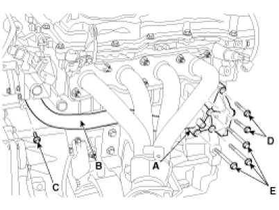 SULEV : Using the SST (09392-2H100) (A), remove the front oxygen sensor (B) and the remove the exhaust manifold heat protector (C).