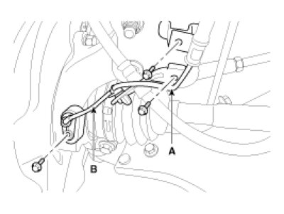 2. Remove the brake hose (A) & wheel speed sensor bracket (B) from the front strut assembly by loosening mounting bolts.
