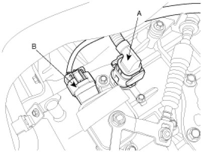 2. Disconnect the solenoid valve connector (A) and inhibitor switch connector (B).