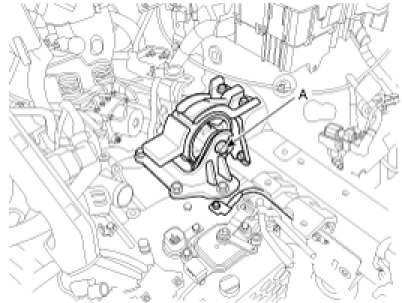 9. Remove the automatic transaxle mounting support bracket bolt (A).