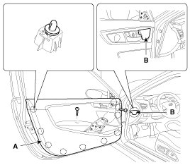 4. Using a screwdriver or remover, remove the front door inside handle cap (B).