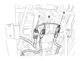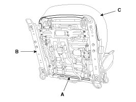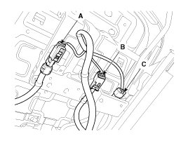 3. Disconnect the airbag connector (A), seat warmer connector (B), seat buckle connector (C).