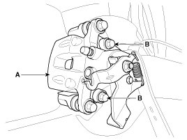 5. Loosen the caliper mounting bolts (B), then remove the rear caliper assembly (A).