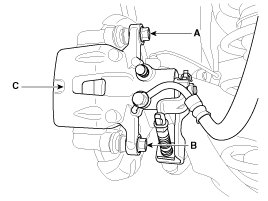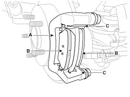 1. Loosen the guide rod bolts (A,B) and then remove the rear caliper body (C).