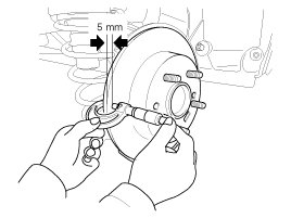 1. Place a dial gauge about 5mm (0.2 in.) from the outer circumference of the brake disc, and measure the runout of the disc.