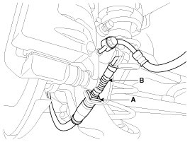 7. Remove the parking brake cable (B), after removing the clip (A).