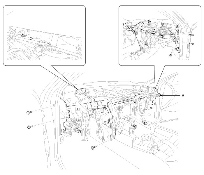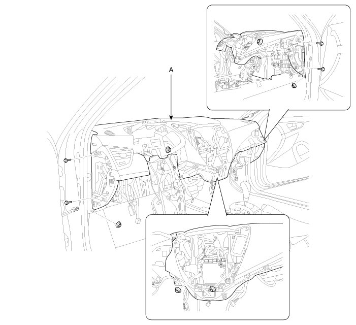 7. After loosening the mounting screws and bolts, then remove the crash pad main lower panel (A).
