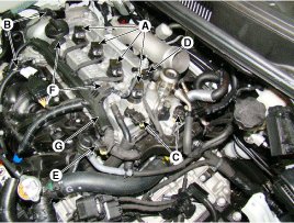 (6) Remove the engine wiring installation bolts (F) and then remove the engine wiring harness (G).