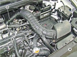 (2) Disconnect the breather hose (B), RCV hose (C) and air intake hose (D).