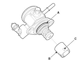 - Apply engine oil to the O-ring (A) of the high pressure fuel pump, the roller tappet (B), and the protrusion (C). Also apply engine oil to the groove on the location where the protrusion (C) is installed.