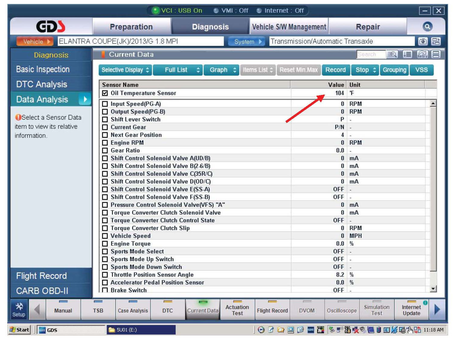 Attach the GDS to the DLC and select vehicle, A/T menu, Current Data and "Oil Temperature Sensor".