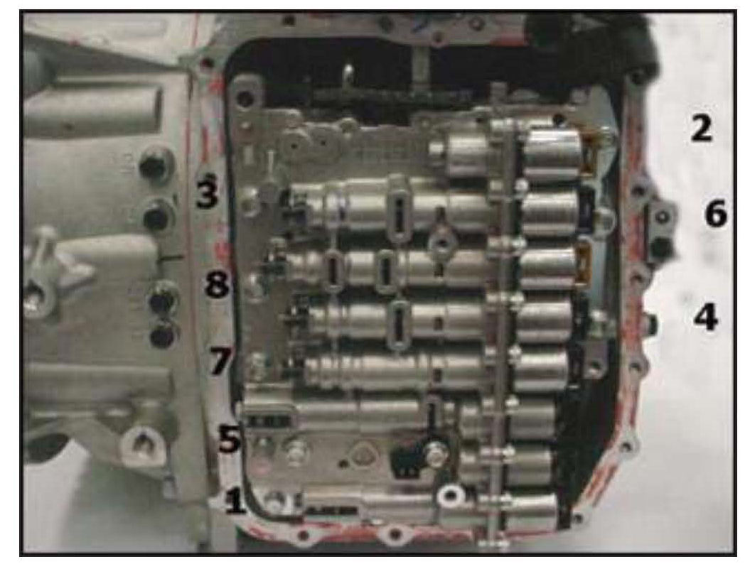 15. Remove 8 bolts in the order shown and remove the valve body.