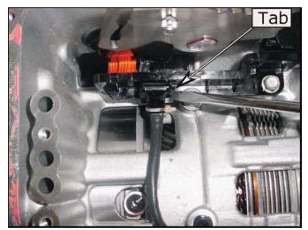 16. Use a screwdriver to depress the locking tab and pull outward on the connector to the input and output speed sensor.