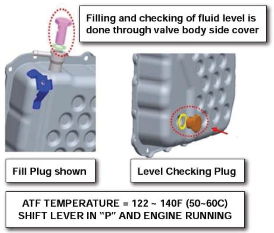 Start the engine and shift to Park. When the ATF is 122F~140F (50~60C), remove the level checking plug. The level is correct when oil flows out of the level checking plug in a thin steady stream.