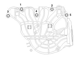 - When installing the intake manifold, tighten the bolts and nuts with pre-torque first, and then tighten the bolts and nuts with specified torque in the sequence shown.