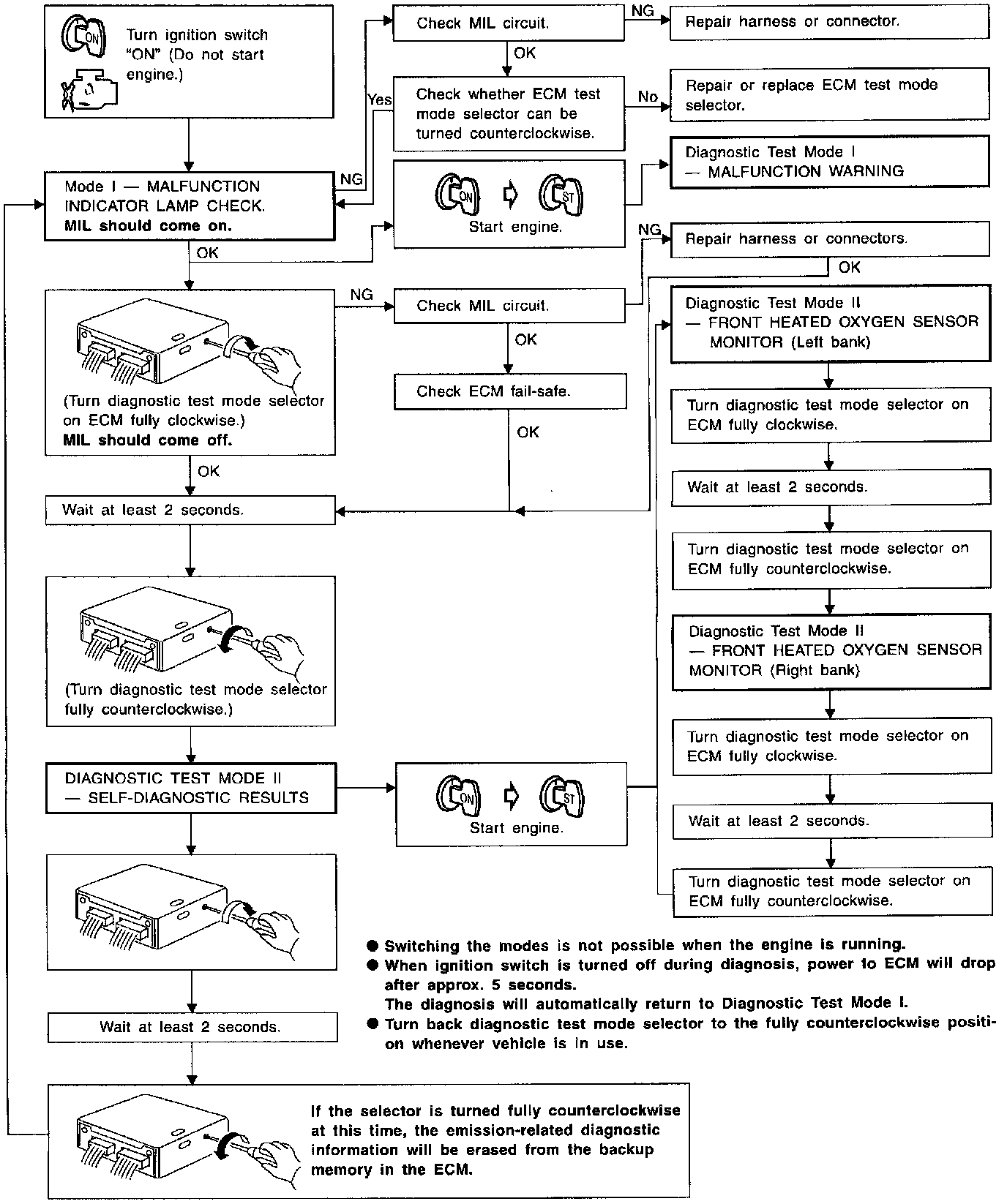 If the ECM is in Diagnostic Test Mode II, MIL may flash when engine is running. In this case, check ECM test mode selector following "How to Switch Diagnostic Test Mode". The following emission-related diagnostic information is cleared when the ECM memory is erased.