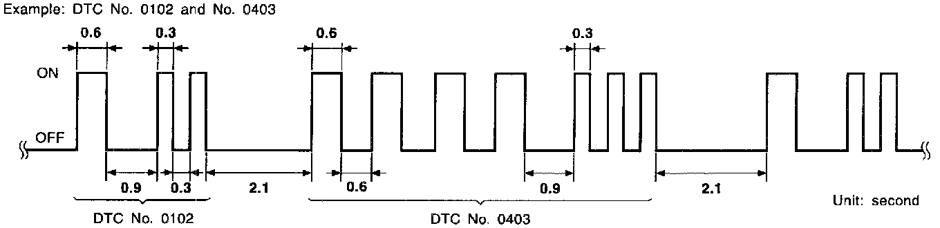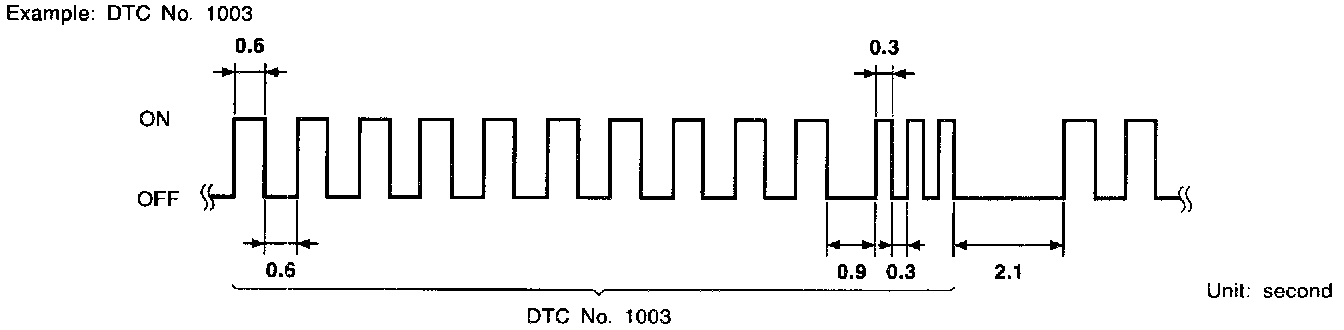 - Long (0.6 second) blinking indicates the two LH digits of number and short (0.3 second) blinking indicates the two RH digits of number. For example, the MIL blinks 10 times for 6 seconds (0.6 sec x 10 times) and then it blinks three times for about 1 second (0.3 sec x 3 times). This indicates the DTC "1003" and refers to the malfunction of the park/neutral position switch.