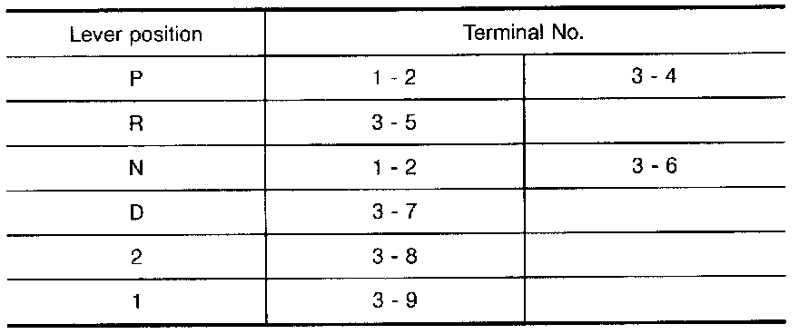 4. If NG on step 2, remove inhibitor switch from A/T and check continuity of inhibitor switch terminals. Refer to step 1.
