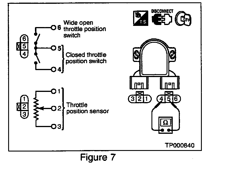 4. Connect an ohm meter across the terminals for the closed throttle position switch (see Figure 7). There should be continuity across the terminals with the throttle closed.