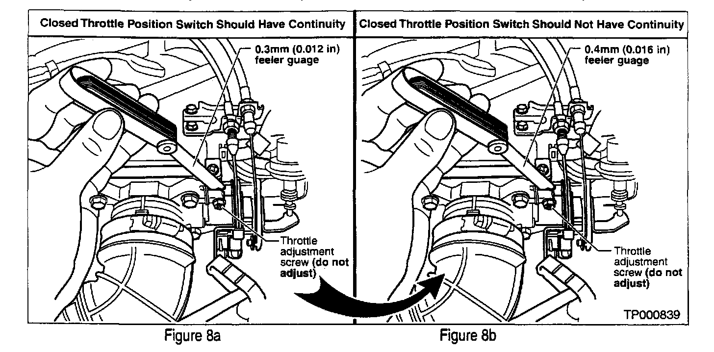 5. Insert a 0.3 mm (0.012 in.) feeler gauge between the throttle adjustment screw and the throttle drum stop (see Figure 8a). The closed throttle position switch should still have continuity.