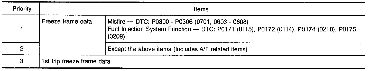 - For example, the EGR malfunction (Priority: 2. was detected and the freeze frame data was stored in the 2nd trip. After that when the misfire (Priority: 1. is detected in another trip, the freeze frame data will be updated from the EGR malfunction to the misfire. The 1st trip freeze frame data is updated each time a different malfunction is detected. There is no priority for 1st trip freeze frame data. However, once freeze frame data is stored in the ECM memory, 1st trip freeze data is no longer stored (because only one freeze frame data or 1st trip freeze frame data can be stored in the ECM). If freeze frame data is stored in the ECM memory and a freeze frame data with the same priority occurs later, the first (original) freeze frame data remains unchanged in the ECM memory.